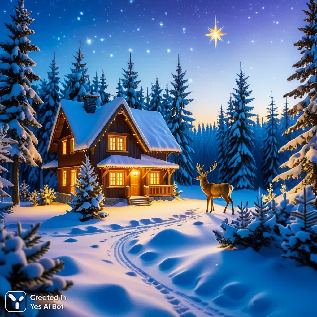 Ночной зимний пейзаж в фиолетово-синих тонах. На переднем плане слева стоит грациозный коричневый олень с ветвистыми рогами, смотрящий вверх. Справа на переднем плане — заснеженный куст с красными ягодами. В центре на заднем плане виден маленький уютный деревянный домик с теплым желтым светом в окнах и дымом из трубы. Рядом с домом стоит маленькая фигурка другого животного. Лес состоит из высоких заснеженных елей. Небо темно-синее, густо усыпано тысячами маленьких звезд. В правом верхнем углу сияет одна огромная, яркая восьмиконечная золотая звезда с длинными лучами.