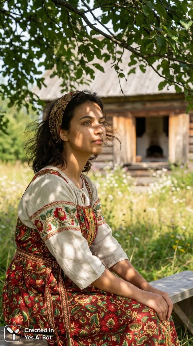 Завораживающая картина русской красоты и уюта. В центре внимания – молодая женщина с оливковой кожей и пронзительными ореховыми глазами, облаченная в традиционное русское народное платье сарафан. Яркие цветочные мотивы насыщенных красного и зеленого цветов украшают ткань, а изящная вышивка вдоль подола добавляет шарма. Простой кожаный корсет подчеркивает ее фигуру. Мягкий солнечный свет пробивается сквозь листву деревьев, создавая игру света и тени на лице девушки, окутывая ее спокойствием и умиротворением. Легкий ветерок нежно треплет пряди волос, добавляя естественности в этот момент запечатленной красоты. Композиция гармонично сочетает в себе фигуру девушки и пышный природный фон. Цветовая палитра, включающая оттенки терракоты, зеленого мха, слоновой кости, бордового и приглушенного красного, создает теплую и уютную атмосферу. На заднем плане расположилась живописная деревянная изба, утопающая в полевых цветах – символ русской деревни и гостеприимства. Сквозь открытое окно виднеется очертание старинной печи, добавляющее аутентичности и домашнего очарования. Фотореалистичное качество изображения с потрясающей детализацией и ультравысоким разрешением позволяет ощутить тепло солнечного дня и вдохнуть аромат полевых цветов. Идеальная картина без лишних деталей и водяных знаков