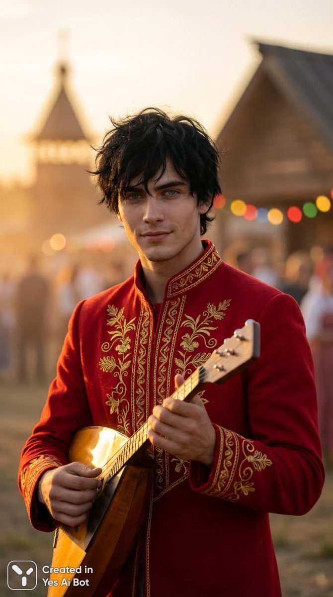 Молодой человек с растрепанными черными волосами и пронзительными серыми глазами запечатлен в момент, когда закатное солнце озаряет его лицо теплым светом. На нем идеально сидящая красная куртка, украшенная замысловатой золотой вышивкой и традиционными русскими узорами, свидетельствующими о глубокой связи с культурным наследием. В руках он держит сверкающую балалайку – символ русской души и народной музыки. Его уверенное выражение лица, расслабленная, но при этом собранная поза говорят о внутренней гармонии и мастерстве исполнителя. На переднем плане яркие краски отражаются от инструмента, создавая ощущение живой энергии и страсти к музыке. Размытый фон с эффектом боке подчеркивает фокус на главном герое и добавляет снимку глубины и загадочности. Вся атмосфера пропитана духом оживленного народного праздника, наполненного радостью и весельем. На заднем плане виднеются силуэты деревянных изб на фоне угасающего неба, украшенные намеками на праздничные декорации. Эфирное освещение создает волшебную атмосферу, приглашая зрителя окунуться в мир русской культуры и традиций. Размытые яркие огни и тени добавляют снимку динамики и живописности. Кинематографичная композиция подчеркивает значимость главного героя, а богатая текстура и фотореалистичные детали создают ощущение полного погружения в сцену. Палитра цветов – сочетание насыщенного красного (#C72A36), теплого золотого (#E6B45B), глубокого темно-синего (#2F3E46) и чистого белого (#FFFFFF) – гармонично дополняет друг друга, создавая визуально привлекательный и запоминающийся образ. Высокое разрешение позволяет рассмотреть каждую деталь, делая этот снимок настоящим произведением искусства