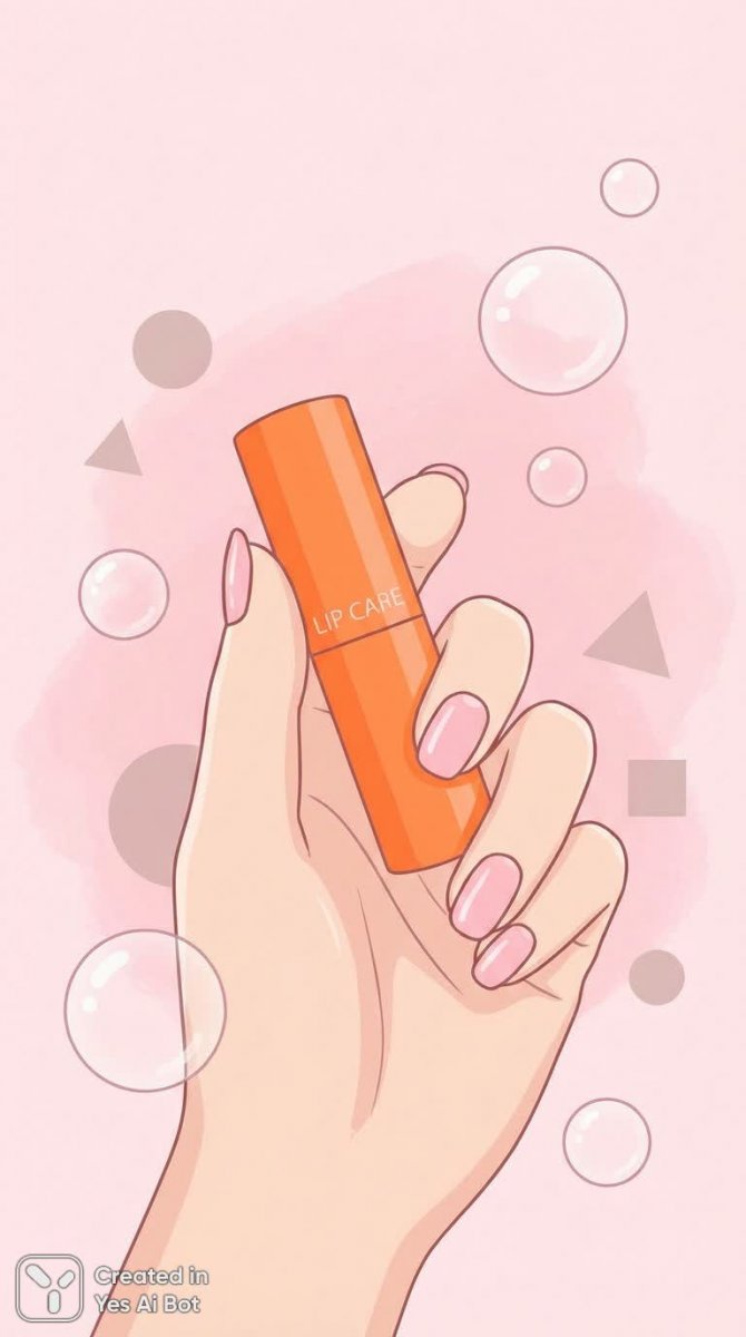 close-up of female hand holding vibrant orange lipstick, soft pink nails, pink background with playful bubbles, geometric shapes subtly appearing, focus on lip care, clean illustration, cheerful vibes.