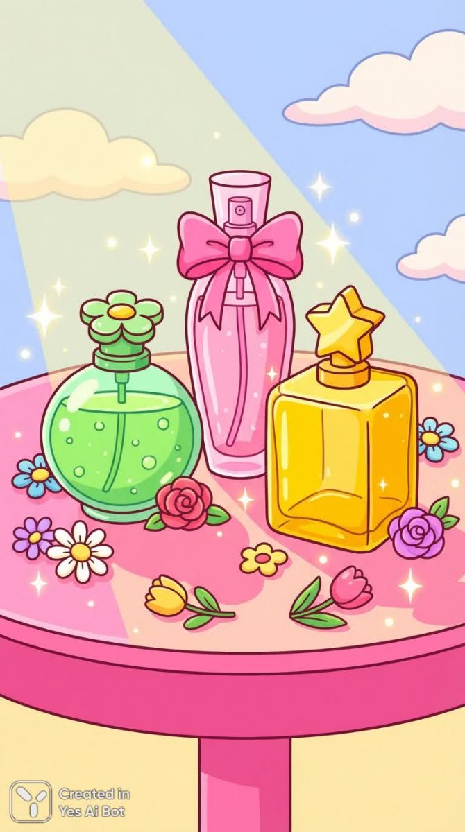 Яркий мир парфюмерии: игривые ароматы в мультяшном стиле - Картинка, созданная нейросетью Nano Banana