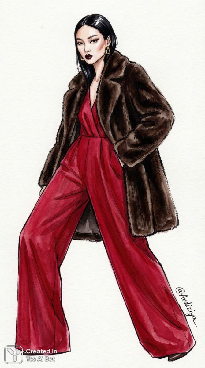 Изящная мода оживает в этой иллюстрации, изображающей молодую женщину в смелом алом комбинезоне с широкими штанинами. Яркий оттенок привлекает внимание и подчеркивает динамичную позу модели, словно застывшей в момент движения. Длинные темные волосы, аккуратно уложенные, создают эффект гладкости и элегантности, гармонируя с минималистичными аксессуарами, которые не отвлекают от основного образа. Макияж выполнен смело и подчеркивает черты лица, добавляя выразительности всему ансамблю. Фон – чистый белый цвет – позволяет полностью сосредоточиться на фигуре модели и деталях ее одежды. Мягкое освещение создает ощущение воздушности и легкости, подчеркивая текстуру ткани и игру света на поверхности комбинезона. Высокое разрешение изображения обеспечивает максимальную четкость деталей и передает всю красоту и изысканность иллюстрации. Эта работа – воплощение современного стиля и элегантной простоты, вдохновляющее своей яркостью и динамикой. Это не просто изображение одежды; это рассказ о уверенности, силе и индивидуальности через призму моды. Искусство иллюстрации достигает нового уровня, демонстрируя мастерское владение цветом, формой и композицией для создания по-настоящему захватывающего образа. Эта иллюстрация – прекрасный пример того, как можно передать настроение и эмоцию с помощью всего лишь нескольких элементов дизайна, создавая визуально привлекательный и запоминающийся образ, который вызывает восхищение своей гармонией и стилем