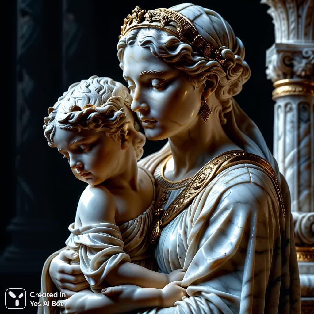 Великолепная кинематографическая фотография, выполненная в профессиональной студии с использованием сложного освещения, демонстрирует потрясающую детализацию и гиперреализм в разрешении 8K UHD. В центре внимания – изысканная мраморная статуя, созданная древнеримским скульптором. Произведение искусства изображает загадочную женщину, окутанную тонкой вуалью, нежно держащую своего ребенка на руках. Голова женщины склонена в знак смирения и глубоких чувств, а выражение лица отражает безграничную любовь и нежность. Черный фон создает драматический контраст, подчеркивая красоту и скульптурные формы статуи, а также добавляя ощущение тайны и величия. Эта работа – пример исключительного мастерства и внимания к деталям, передающий вечные темы материнства, красоты и духовности. Композиция идеально сбалансирована, а игра света и тени создает объемный эффект, оживляя мраморную скульптуру. Каждая складка ткани, каждая черта лица проработана с невероятной точностью, что позволяет зрителю ощутить дыхание истории и прикоснуться к гению древних мастеров. Это не просто фотография – это визуальная поэма о любви и красоте, запечатленная в вечности. Идеально подходит для коллекционеров искусства или тех, кто ценит высокое качество исполнения и эстетическую ценность
