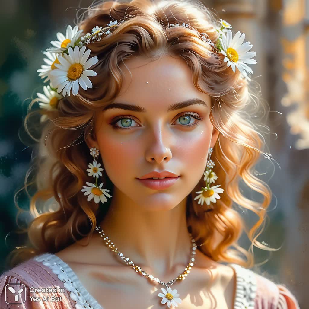 Изящный портрет молодой женщины в акварельно-акриловой технике завораживает своей нежностью и воздушностью. Ее взгляд, наполненный глубиной небесно-голубых глаз, приковывает внимание, а светлые каштановые волосы с текстурой волн создают ощущение естественной красоты. Аккуратная прическа украшена крошечными белыми ромашками, мерцающими мягким светом, добавляя образу сказочности и очарования. Женщина одета в уютный вязаный топ пыльно-розового оттенка с элегантным V-образным вырезом, подчеркивающим ее изящную шею. Серебряные серьги-цепочки и кольца придают облику нотку утонченности и благородства. В легком жесте она подносит одну ромашку к своим губам, словно собираясь прошептать тайну. Мягкий рассеянный естественный свет окутывает ее фигуру, создавая атмосферу спокойствия и безмятежности. Небольшая глубина резкости акцентирует внимание на лице женщины, размывая фон в приглушенно-желто-зеленые тона, что добавляет картине визуальной гармонии и глубины. Стиль изображения напоминает комиксный арт с его плавными линиями и мягкими переливами цвета. Вся композиция пронизана ощущением хрупкости, нежности и мечтательности, представляя собой прекрасный пример современного изобразительного искусства, сочетающего в себе элементы реализма и фантазии. Это работа, которая заставляет зрителя задуматься о красоте момента и силе женственности