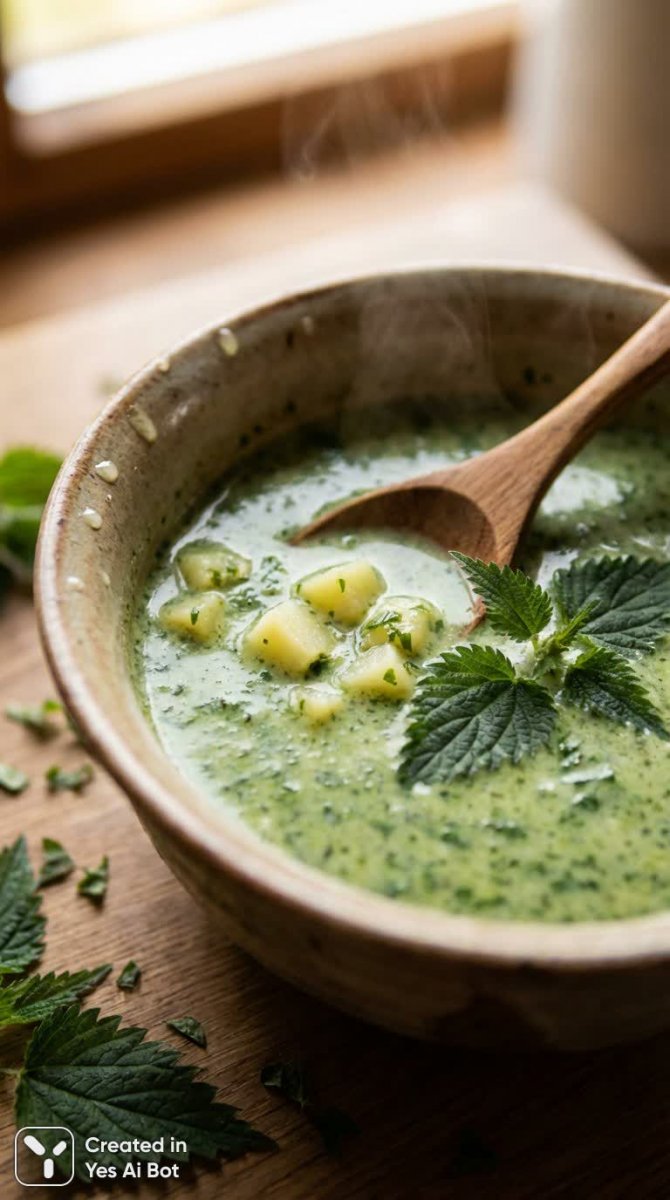 Изумительный српный суп из крапивы: домашний уют и польза в каждом глотке - Пример генерации нейросети NanoBanana