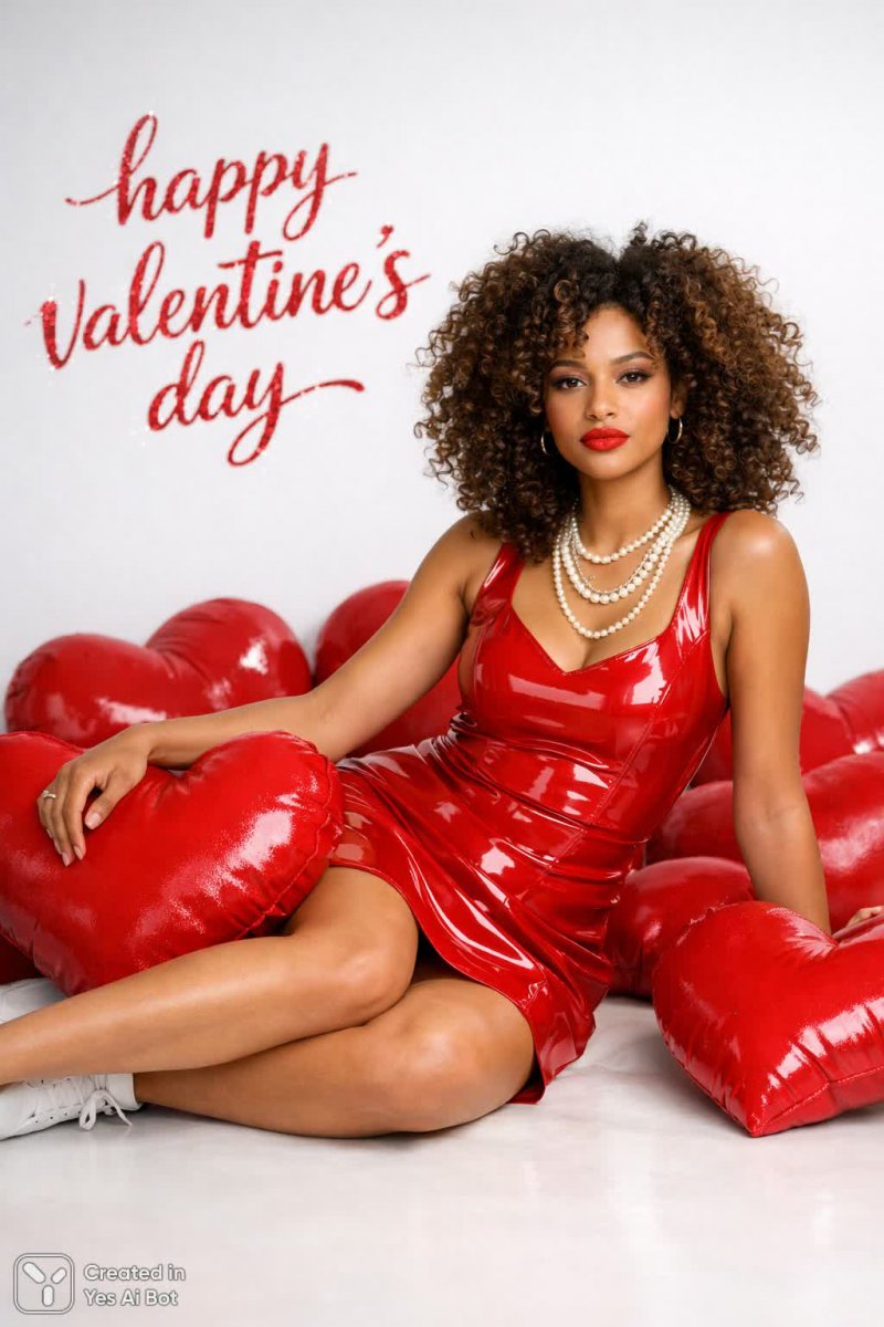 ultra hd, high detail, young woman with voluminous curly hair, wearing glossy red mini dress with candy-like shine, oversized red heart-shaped pillows scattered around, layered pearl necklaces, minimalist sneakers, soft diffused lighting, "happy valentine's day" written in sparkling red on background, confident calm gaze, clean white studio floor, modern fashion campaign style, jewelry subtle, natural makeup with bold red lip, sony a7r iv, zeiss batis 85mm f/1.8, iso 200, 1/125s, f/1.8