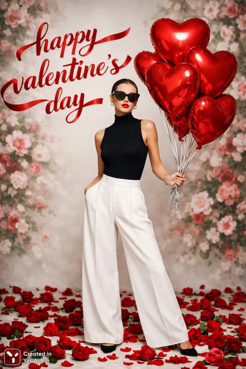 Молодая женщина в стильном черном боди и широких белых льняных брюках позирует для глянцевого журнала. Её образ дополняют большие солнцезащитные очки и яркая красная помада, а вокруг разбросаны свежие красные розы. В руках она держит металлические наручники, прикрепленные к воздушным шарам в форме сердца, символизирующим любовь. Над девушкой парят ленты с надписью 'счастливого дня святого Валентина'. Съемка выполнена на профессиональную камеру Fujifilm GFX 100, что позволило запечатлеть каждую деталь с высокой четкостью и глубиной. Изображение представляет собой яркую fashion-кампанию, созданную нейросетью Sora Images в стилях Fashion и Luxury, акцентирующую внимание на деталях и элегантности модели. Фон украшен цветочным рисунком, а освещение мягкое и студийное, создающее ощущение легкости и воздушности. Аккуратный макияж и деликатные украшения завершают образ, подчеркивая утонченность.