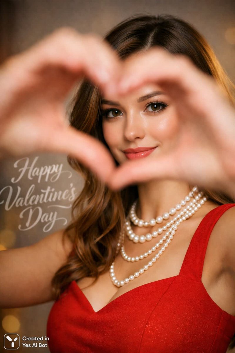 Изысканный портрет современной красоты в стиле коммерческой фотографии. Перед зрителем предстает женщина с безупречными чертами лица, точно повторяющими образ выбранной модели. Она одета в облегающее красное мини-платье, дополненное элегантными жемчужными ожерельями, создавая атмосферу роскоши и изысканности. На переднем плане ее руки нежно формируют форму сердца, сквозь которое она слегка выглядывает с игривой улыбкой, добавляя портрету нотку романтики и кокетства. Мягкое освещение подчеркивает сияющую кожу и деликатную улыбку, создавая ощущение тепла и уюта. Небольшая глубина резкости акцентирует внимание на лице модели, размывая фон и добавляя изображению воздушности. В заднем плане, написанные изящным почерком слова 'счастливого дня святого Валентина' усиливают тематику праздника любви и романтики. Снято на профессиональную камеру Canon EOS-1D X Mark III с объективом EF 85mm f/1.4L IS USM при ISO 320, выдержке 1/200 секунды и диафрагме f/1.8, что обеспечивает высокую детализацию и красивое размытие фона. Композиция картины отличается чистотой и лаконичностью, что подчеркивает красоту модели и создает общее впечатление совершенства и элегантности. Это идеальный образ для рекламы красоты или праздничной кампании