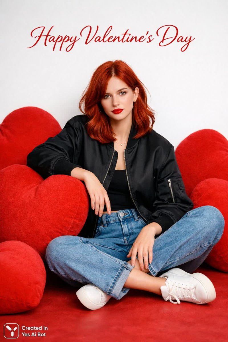 ultra hd, fashion editorial style, young woman with copper red hair, relaxed fit blue jeans, black bomber jacket, minimalist sneakers, oversized red heart pillows, vibrant red and white color palette, soft confident gaze, clean composition, jewelry subtle, lips painted classic red, "happy valentine's day", studio setup, nikon z7 ii, nikkor z 85mm f/1.8 s, iso 125, f/2.8, 1/200s