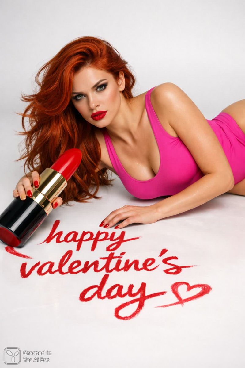 Роскошная рекламная фотография демонстрирует рыжеволосую модель в облегающем ярко-розовом латексом костюме, лежащую на белом полу. В руках она держит увеличенную помаду и пишет надпись 'счастливого дня святого Валентина' прямо на полу. Акцент сделан на ярком красном цвете губ модели, который гармонирует с цветом костюма, создавая праздничное настроение. Фотография выполнена в высочайшем разрешении 8k, что позволяет рассмотреть мельчайшие детали текстуры латекса и блеск помады. Съемка производилась при естественном освещении с использованием профессионального оборудования Canon EOS R5, обеспечивающего безупречное качество изображения. Композиция кадра построена таким образом, чтобы привлечь внимание зрителя к лицу модели и продукту – помаде. Чистый студийный фон подчеркивает образ современной красоты, смелости и уверенности в себе, что идеально подходит для продвижения премиального косметического бренда и создания ассоциации с праздником любви и красоты. Фотография излучает энергию, страсть и соблазнительность, передавая игривое настроение и создавая запоминающийся рекламный образ.