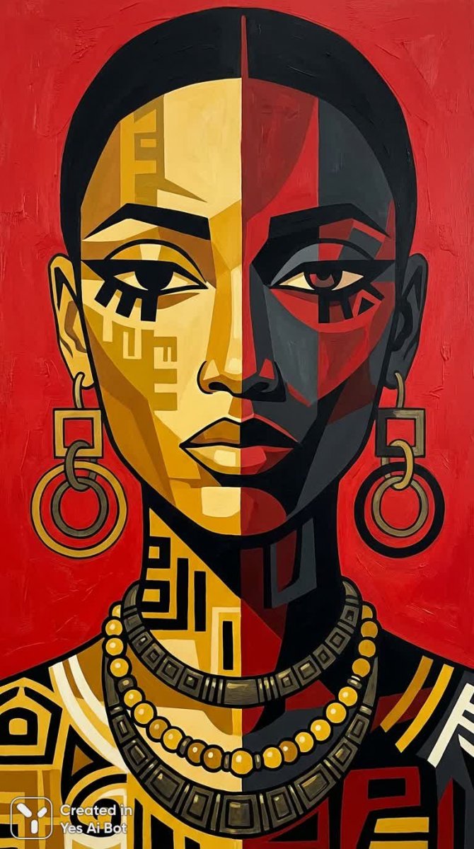 Современный портрет африканской женщины, выполненный в стиле кубизма с использованием нейросети NanoBanana. Лицо разделено на две контрастные половины – желтую и черную, что символизирует многогранность африканской культуры. Образ дополнен крупными геометрическими серьгами, стилизованными глазами, абстрактными узорами, напоминающими татуировки, и украшениями. Фон выполнен в насыщенном красном цвете, усиливая драматизм и добавляя энергии композиции. Вся работа выдержана в минималистичном стиле, сочетая этнические мотивы с современным графическим дизайном, демонстрируя силу и красоту африканской женщины через лаконичные формы и яркие цвета. Изображение представляет собой визуально привлекательную и динамичную композицию, созданную для ценителей современного искусства и этнической эстетики, где сочетаются традиции прошлого и инновации настоящего.
