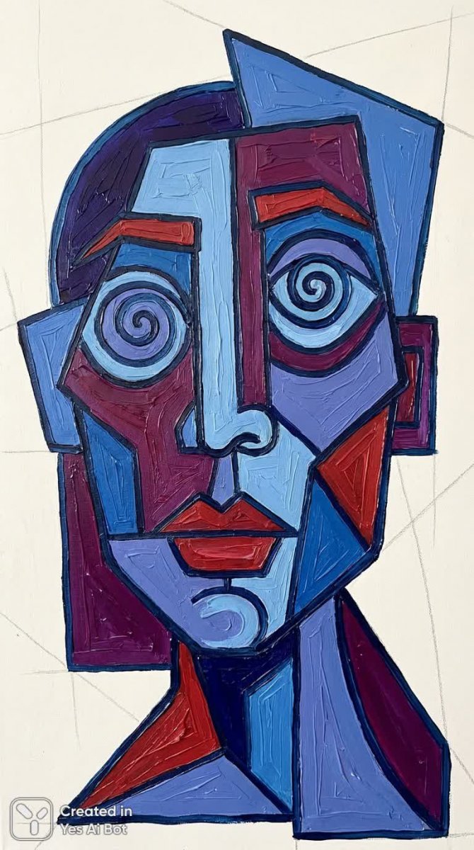 Яркий и динамичный кубистический автопортрет, воплощенный в смелом сочетании многоцветных геометрических форм. Преобладают глубокие синие, насыщенные пурпурные и огненные красные тона, создающие визуальную гармонию и контраст одновременно. Лицо изображено асимметрично, подчеркивая деконструкцию классических художественных канонов. Губы стилизованы, приобретая почти графический вид, а спиральные элементы добавляют композиции загадочности и глубины. Манера письма характеризуется выразительными, толстыми мазками кисти, которые передают текстуру масляной краски и придают работе живость и энергию. Фон выполнен в простом, светлом стиле, чтобы не отвлекать внимание от основной темы – портрета. Использование графических элементов усиливает современный характер произведения, подчеркивая его связь с искусством XX века. В целом, работа представляет собой яркий пример современной абстрактной живописи, демонстрирующий мастерство художника в работе с формой, цветом и текстурой. Изображение обладает плоскостностью, что еще больше акцентирует внимание на геометрических формах и их взаимосвязи, создавая уникальный визуальный опыт для зрителя. Картина излучает энергию и творческий порыв, являясь свидетельством смелых экспериментов в области современного искусства
