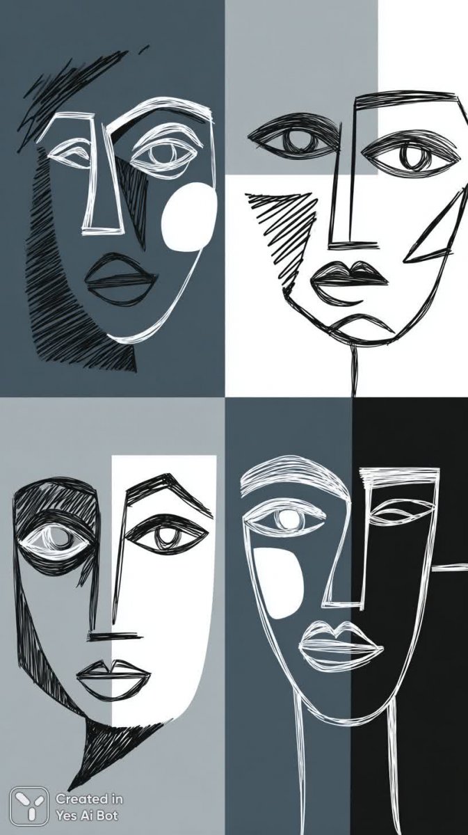 Четыре монохромных портрета лица в стиле абстрактного минимализма, выполненные графическими линиями и геометрическими формами. Каждое лицо стилизовано под разные эмоциональные состояния, передающие широкий спектр чувств от задумчивости до экспрессии. Изображения отличаются лаконичностью форм и плоскостным фоном, что подчеркивает акцент на деталях лица. Особое внимание уделено глазам – они большие, выразительные, словно окна в душу каждого персонажа. Стиль рисунка напоминает технику маркеров, создавая четкие контуры и графическую ясность. Композиция построена таким образом, чтобы каждый элемент гармонично сочетался с остальными, формируя целостное произведение искусства. Эта серия работ исследует тему человеческих эмоций через призму абстракции, предлагая зрителю задуматься о глубине внутреннего мира. Использование черно-белой палитры усиливает драматизм и выразительность образов, создавая эффектную визуальную игру света и тени. Каждый портрет – это отдельная история, рассказанная без слов, через язык линий и геометрических фигур