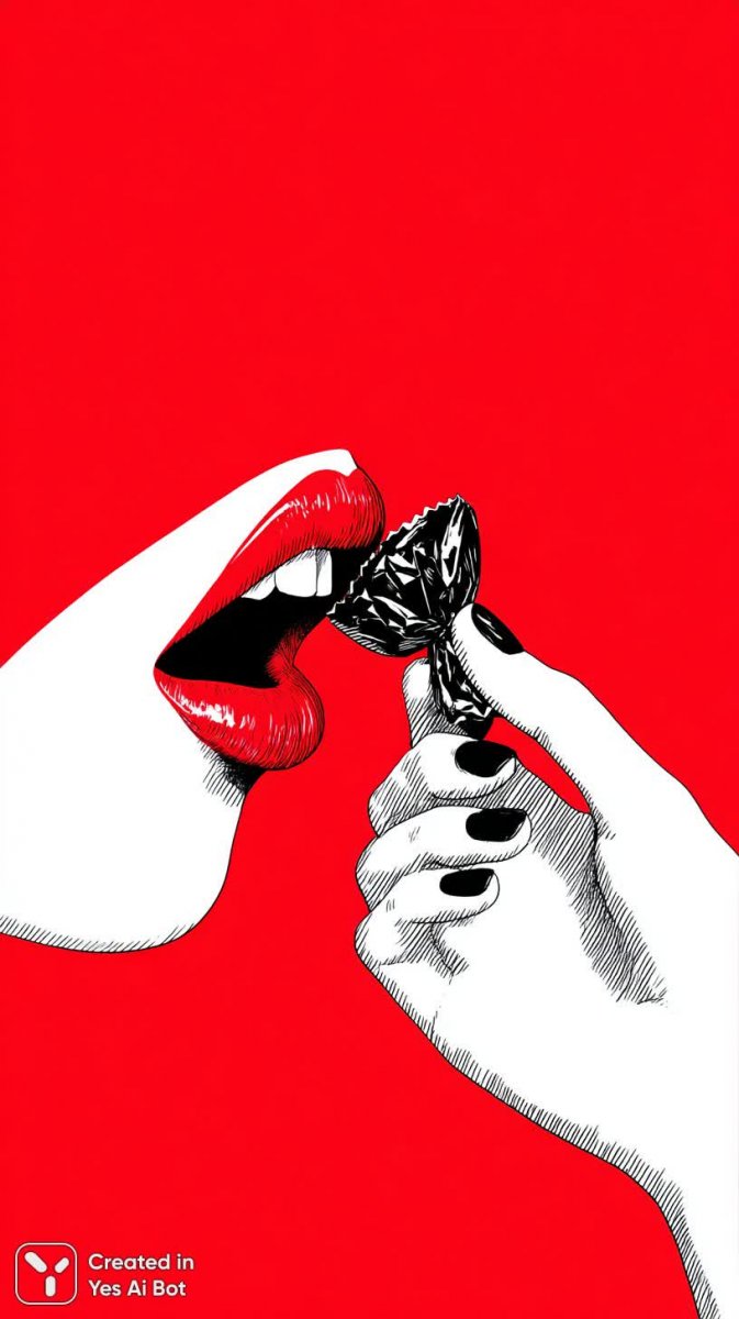 Изящные женские губы, приковывающие взгляд глянцевой красной помадой, становятся центром внимания в этой стильной векторной иллюстрации. Рядом с соблазнительным изгибом губ располагается рука, держащая черно-белую лакричную конфету в полоску — контрастный акцент на фоне чистого белого пространства. Минималистичный дизайн и четкие линии подчеркивают современный подход к визуальному искусству, создавая ощущение легкости и элегантности. Иллюстрация выполнена в духе поп-арта, что добавляет ей игривости и динамичности, делая акцент на ярких цветах и простых формах. Сфокусированное внимание на губах и конфете создает захватывающий визуальный образ, который одновременно привлекает и интригует зрителя. Чистота исполнения и отсутствие лишних деталей подчеркивают профессионализм художника, а векторная графика позволяет масштабировать изображение без потери качества. Этот графический элемент идеально подойдет для различных целей — от дизайна упаковки до создания ярких рекламных материалов, привнося в проект нотку изысканности и современного стиля. Белый фон создает ощущение воздушности и чистоты, позволяя основным элементам изображения - губам и конфете – максимально выделиться и привлечь внимание к своей красоте и контрасту. Использование векторной графики гарантирует его адаптивность для любых форматов и разрешений, сохраняя четкость линий и насыщенность цветов