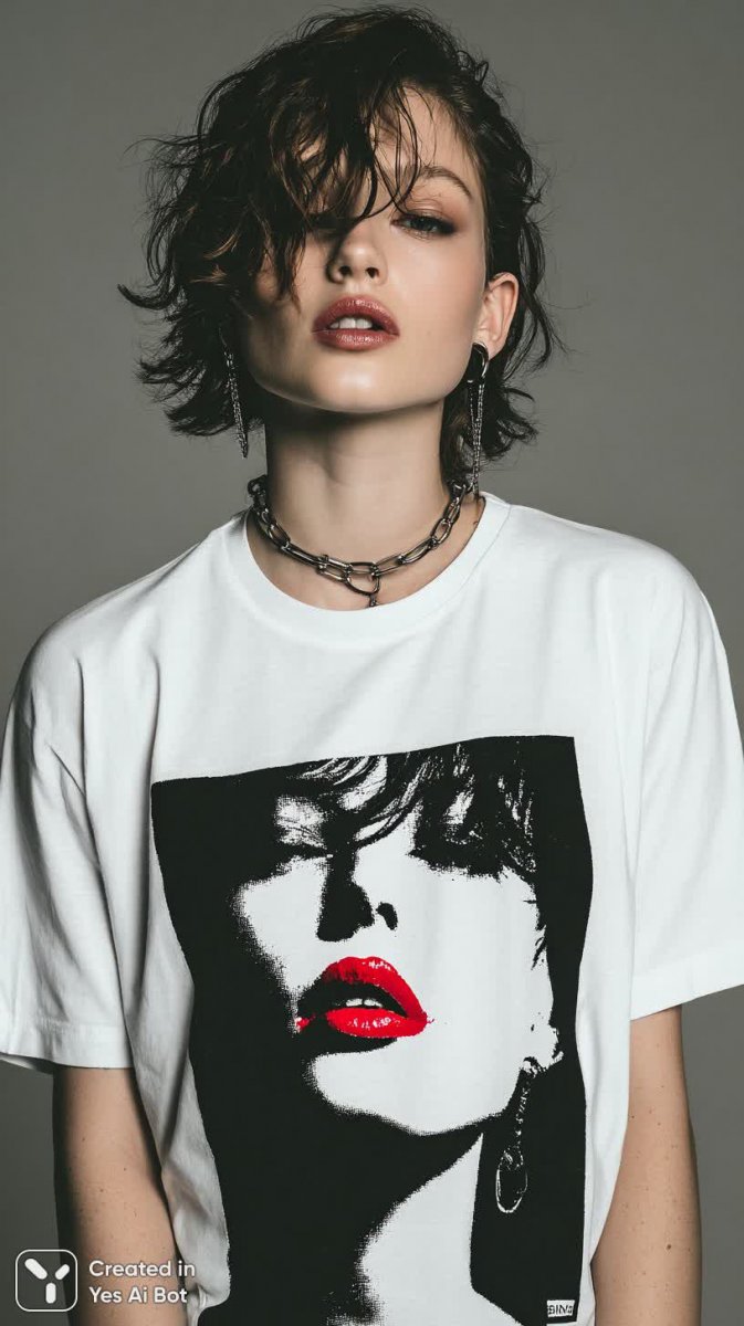 fashion model, minimalist style, large graphic print of a woman's face, bright red lips, black and white color palette, casual look, stylish jewelry, modern urban scene.