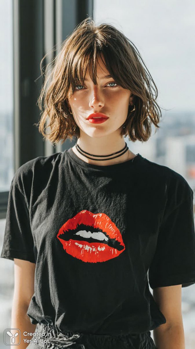 fashion model, woman in a black t-shirt with abstract face print, minimalist style, bright red lips, trendy summer look, casual urban environment, bold graphic elements --s 750 --style raw
