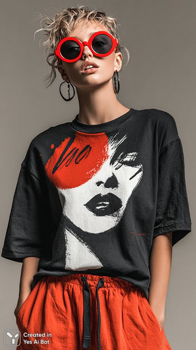 Изысканная мода воплощена в образе современной женщины. В центре внимания – элегантный черный топ с минималистичным рисунком, изображающим женское лицо. Акцент на смелых красных губах и больших круглых очках придает образу неповторимый шарм и индивидуальность. Стиль casual urban подчеркивает непринужденность и динамичность городской жизни, создавая ощущение естественной уверенности в себе. Высококачественное фото передает мельчайшие детали, демонстрируя современную элегантность и безупречный вкус. Эта фотография – манифест современной красоты, сочетающий в себе простоту линий и смелость акцентов, олицетворяющий собой дух свободы и самовыражения. Образ излучает уверенность и подчеркивает уникальность каждой женщины, позволяя ей чувствовать себя комфортно и стильно в любой ситуации. Эта фотография - воплощение модных тенденций, отражающих актуальные тренды и вдохновляющих на создание собственных неповторимых образов. Акцент на деталях – от тщательно подобранного топа до выразительных аксессуаров – создает гармоничный ансамбль, демонстрирующий безупречное чувство стиля. Это больше, чем просто фотография – это история о сильной и уверенной в себе женщине, которая не боится быть собой и следовать своим мечтам