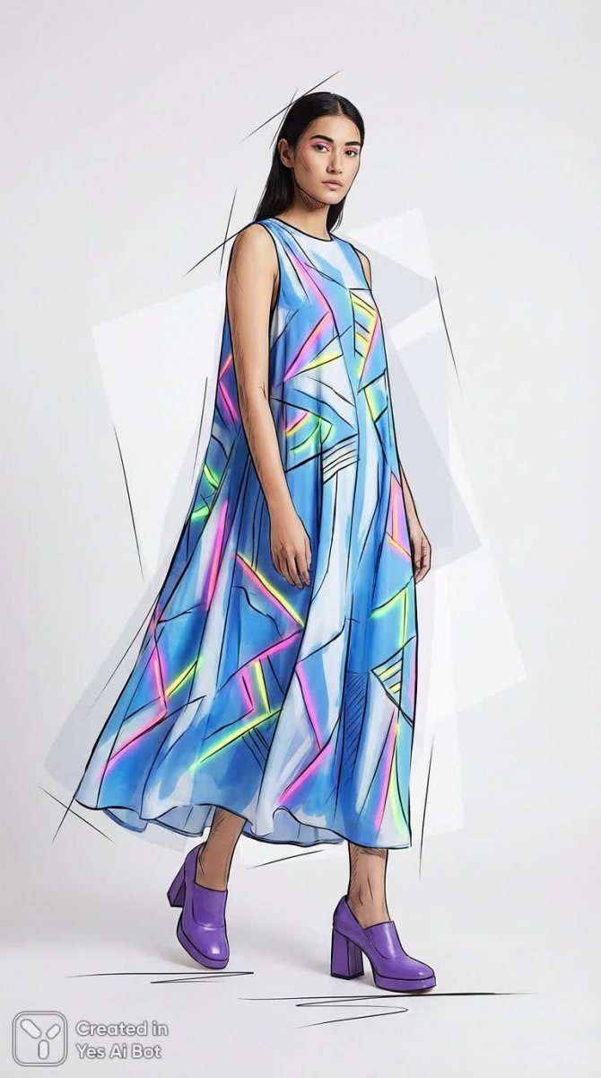 nanobanana Неоновая геометрия: стильный образ в летнем платье с абстрактным принтом и фиолетовыми туфлями. Генерация из нейросети Нано Банана