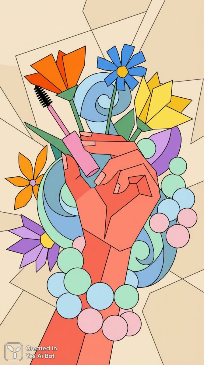 Нежная женская рука с коралловым маникюром бережно держит флакон розовой туши для ресниц. Вокруг царит атмосфера радости и легкости: яркие цветы разных оттенков танцуют в вихре позитива, а округлые пастельные сферы добавляют образу воздушности и нежности. Фон выполнен в светлых бежевых тонах, создавая ощущение уюта и спокойствия. Стиль изображения выдержан в минималистичном мультяшном исполнении, что придает ему игривость и свежесть. Вся композиция пронизана жизнерадостным эстетическим настроением, идеально подходящим для подчеркивания женственности и красоты. Этот визуальный образ воплощает собой легкость бытия и радость от простых вещей – ухода за собой и наслаждения моментом. Он словно приглашает окунуться в мир ярких красок и позитивных эмоций, где каждая деталь наполнена гармонией и элегантностью. Использование пастельных тонов в сочетании с насыщенными цветами создает эффектную игру контрастов, делая изображение еще более привлекательным и запоминающимся. Это прекрасный пример того, как минимализм может быть одновременно выразительным и стильным, а также способным передать тонкие нюансы настроения и характера. Изображение излучает оптимизм и вдохновение, заряжая энергией и желанием творить красоту