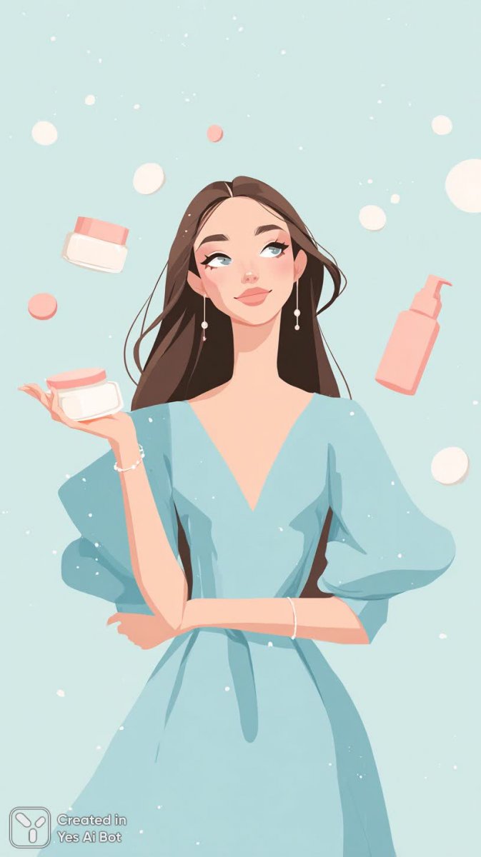 Изящная женщина с прямыми каштановыми волосами предстает в нежно-голубом платье, создавая ощущение легкости и воздушности. В ее руках застыли в танце парящие косметические баночки и флакон распылителя розового цвета, что добавляет сцене игривости и волшебства. На лице – искренняя улыбка, отражающая радость и уверенность. Фон выполнен в светлых оттенках розового, подчеркивая нежность образа и создавая ощущение уюта. Это забавная и причудливая иллюстрация, выполненная в минималистичном стиле с акцентом на плавные линии и мягкие цвета. Женщина украшена лишь скромными украшениями, что позволяет сосредоточить внимание на ее естественной красоте и гармонии с окружающим пространством. Картина излучает позитив и вдохновляет на эксперименты с модой и красотой, демонстрируя элегантность в сочетании с чувством юмора. Иллюстрация передает атмосферу беззаботности и женственности, идеально подходящую для рекламы косметических средств или создания визуального контента для блогов о красоте и стиле. Ее легкость и позитив делают ее привлекательной для широкой аудитории, а сдержанный дизайн позволяет использовать ее в различных контекстах. Образ женщины воплощает собой современную элегантность и подчеркивает важность ухода за собой с удовольствием