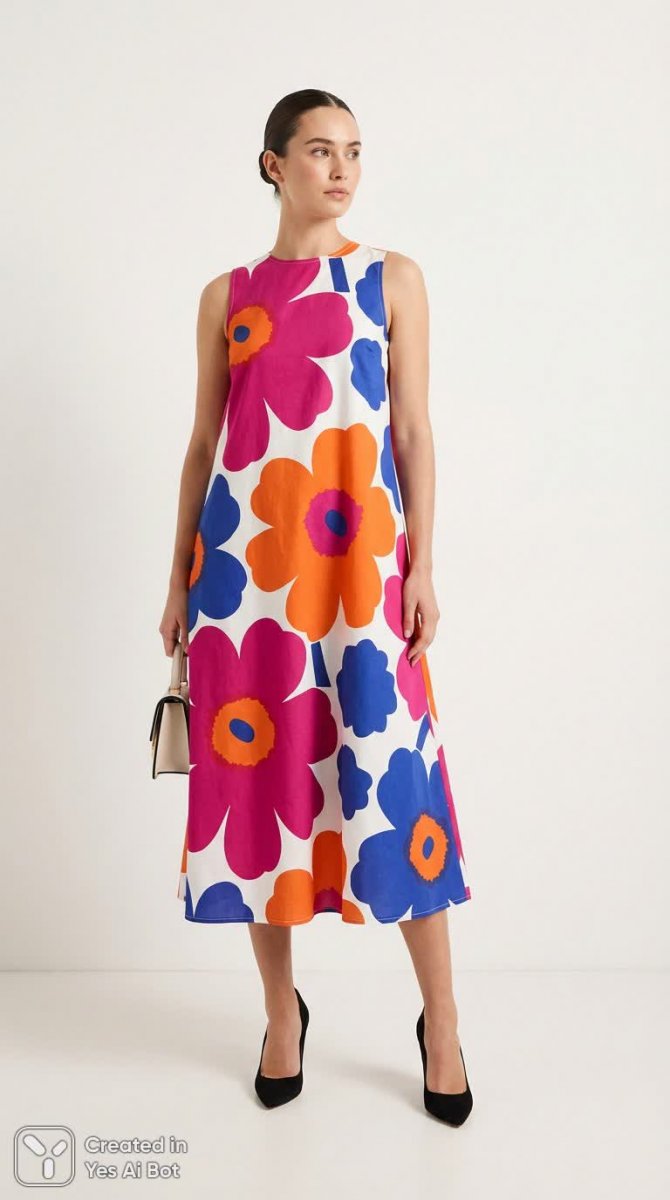 depict a woman wearing a sleeveless A-line dress with a bold floral print, styled with high heels, emphasizing both minimalism and vibrant colors, captured in high resolution against a simple white backdrop.