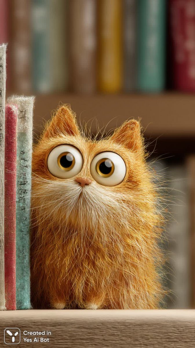 Очаровательный рыжий котенок с пушистой шерсткой и огромными круглыми глазами забавно выглядывает из-за яркой красочной книги. Иллюстрация выполнена в теплых тонах и напоминает добрый мультфильщик, при этом поражает детализированной проработкой каждого волоска шерстки, создавая эффект реалистичности. Мягкий рассеянный свет подчеркивает уютную атмосферу библиотеки, где котенок словно нашел свое укромное место для игр и исследований. Портретный снимок передает непосредственность и любопытство маленького зверька, вызывая у зрителя чувство тепла и нежности. Эта картина – воплощение домашнего уюта и беззаботной радости, идеальная иллюстрация для создания позитивного настроения и напоминания о простых жизненных удовольствиях. Детализация шерстки позволяет рассмотреть каждый отдельный волосок, создавая удивительно реалистичный эффект, несмотря на общий стиль мультфильма. Это не просто изображение котенка, а целая история, запечатленная в ярких красках и мягком свете, приглашающая зрителя окунуться в мир детства и волшебства
