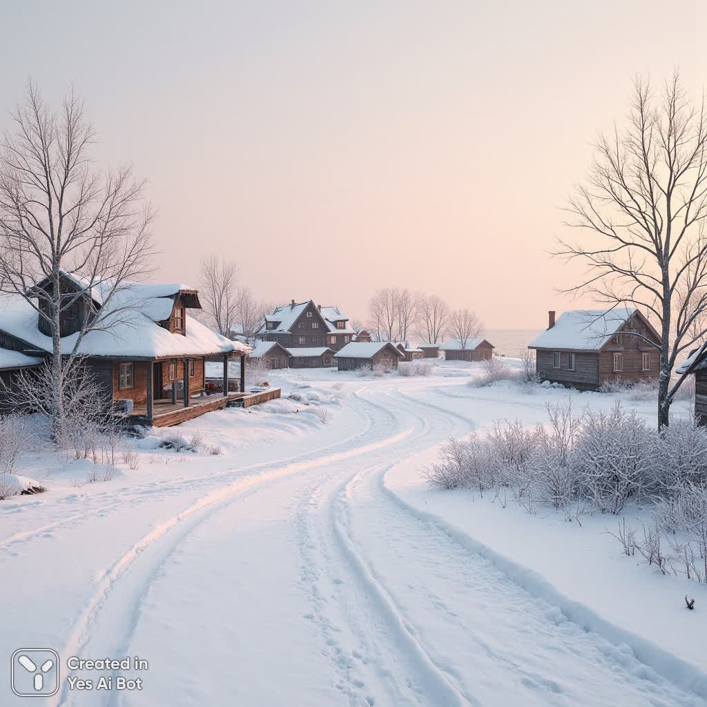 Заснеженный зимний пейзаж очаровывает покоем и уютом, словно запечатленный в золотых лучах восходящего солнца. В центре внимания – живописная деревушка с вытянутой вдоль берега линией старинных деревянных домов, утопающих в сугробах. Каждая постройка хранит отпечаток времени: обветшалые стены, темное дерево, контрастирующее с ослепительной белизной снежных крыш и примыкающих к ним хозяйственных построек. Голые ветви деревьев, словно тонкие чернильные линии на фоне нежного рассвета, добавляют композиции графичности и подчеркивают безмолвную красоту зимней природы. Передний план занимает бескрайняя гладь заснеженной поверхности, едва заметные следы отколовшиеся шины свидетельствуют о недавней активности, нарушая идеальную гармонию пейзажа. Мягкий, рассеянный свет окутывает всю сцену, создавая атмосферу безмятежности и одиночества. Нежная палитра – сочетание белого, бледно-розового и оранжевого оттенков с легкими вкраплениями приглушенного зеленого на крышах – передает ощущение легкой зимней прохлады и умиротворения. Сбалансированная композиция, где деревья и дома образуют естественную раму для центральной части пейзажа, завершает этот завораживающий вид, погружая зрителя в мир спокойствия и тихой красоты. Картина выполнена в стиле зимнего реализма, вызывая чувство глубокой связи с природой и ощущение уединенности