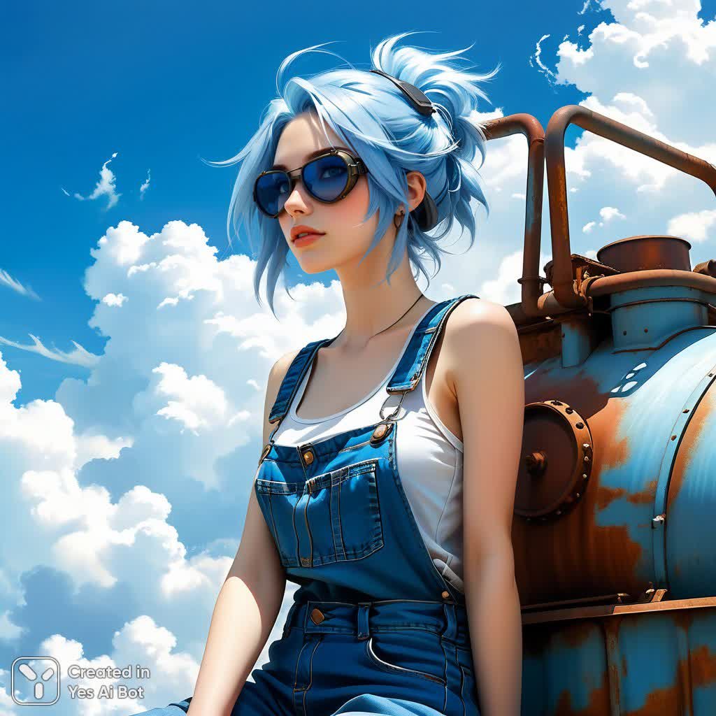 На этой яркой цифровой иллюстрации изображена молодая женщина с бледной кожей и необычно голубыми волосами, облаченная в простую майку на бретелях и джинсовый комбинезон. Она уверенно уселась прямо поверх старого, ржавого металлического бака, словно это её личный трон. За ней простирается безмятежное голубое небо, украшенное пушистыми белыми облаками, создающими ощущение лёгкости и простора. Лицо девушки выражает серьёзность и сосредоточенность – её взгляд устремлен вдаль, а на голове надежно закреплены защитные очки, намекающие на какую-то важную миссию или занятие. Стиль рисунка явно вдохновлён аниме: чёткие, уверенные линии, яркие, насыщенные цвета и динамичная композиция создают неповторимую атмосферу. Вся картина продумана до мелочей – каждая деталь тщательно выверена, от текстуры металла бака до отдельных прядей волос девушки. Присутствует лёгкий эффект состаренности, придающий изображению винтажный, немного грубый шарм. Главная героиня занимает центральное место в композиции, а небольшой наклон её майки добавляет глубины и ощущения перспективы, вовлекая зрителя в происходящее. Это завораживающее сочетание современности и ретро, силы и хрупкости, создаёт запоминающийся образ девушки-механика или исследователя, готовой к любым приключениям