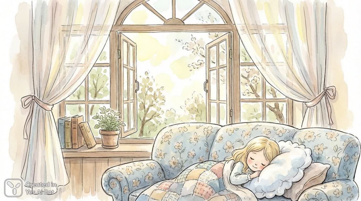 Светлая акварель: девочка спит в весенней комнате у окна с солнцем - Изображение, созданное нейросетью Nano Banana