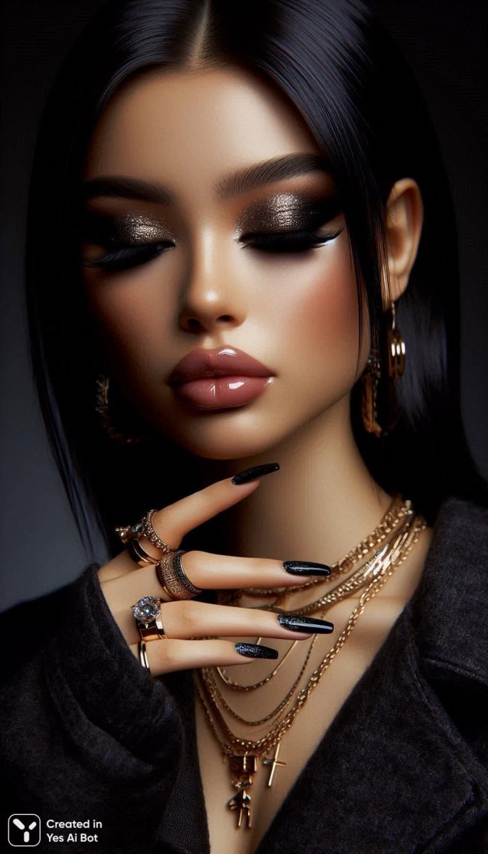Портрет молодой женщины, воплощающий в себе дерзкий гламур и современную эстетику. Ее длинные черные волосы контрастируют с сияющим макияжем: мерцающие тени на веках подчеркивают выразительность взгляда, а драматичные ресницы добавляют глубины и объема. Губы покрыты глянцевой помадой, создающей эффект соблазнительной чувственности. Акцент сделан на деталях – ногти украшены сочетанием черного и блестящего лака, а пальцы переливаются от множества золотых колец. Элегантные многослойные цепочки из золота дополняют образ, подчеркивая утонченный вкус. Черная куртка придает образу нотку бунтарства и уверенности. Фотография выполнена в стиле fashion close-up с акцентом на деталях и высокой степенью детализации. Фон затемненный и размытый, что позволяет зрителю полностью сосредоточиться на модели и ее неповторимом образе. Студийное освещение создает идеальную экспозицию, подчеркивая текстуру кожи и блеск украшений. Это яркий пример современной фотографии моды, демонстрирующий гармоничное сочетание стиля, красоты и индивидуальности. Вся композиция пронизана атмосферой роскоши и уверенности в себе, заставляя зрителя восхищаться безупречным вкусом и чувством меры модели