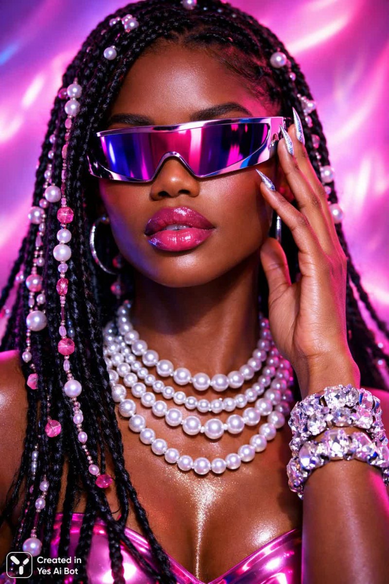 dark-skinned female, afro braids with pearls and pink beads, futuristic glasses, chrome nails, pearl necklaces, crystal bracelets, glossy lips, neon pink-purple lighting, abstract soft glow bg, cyber-glam style, high detail, fashion portrait