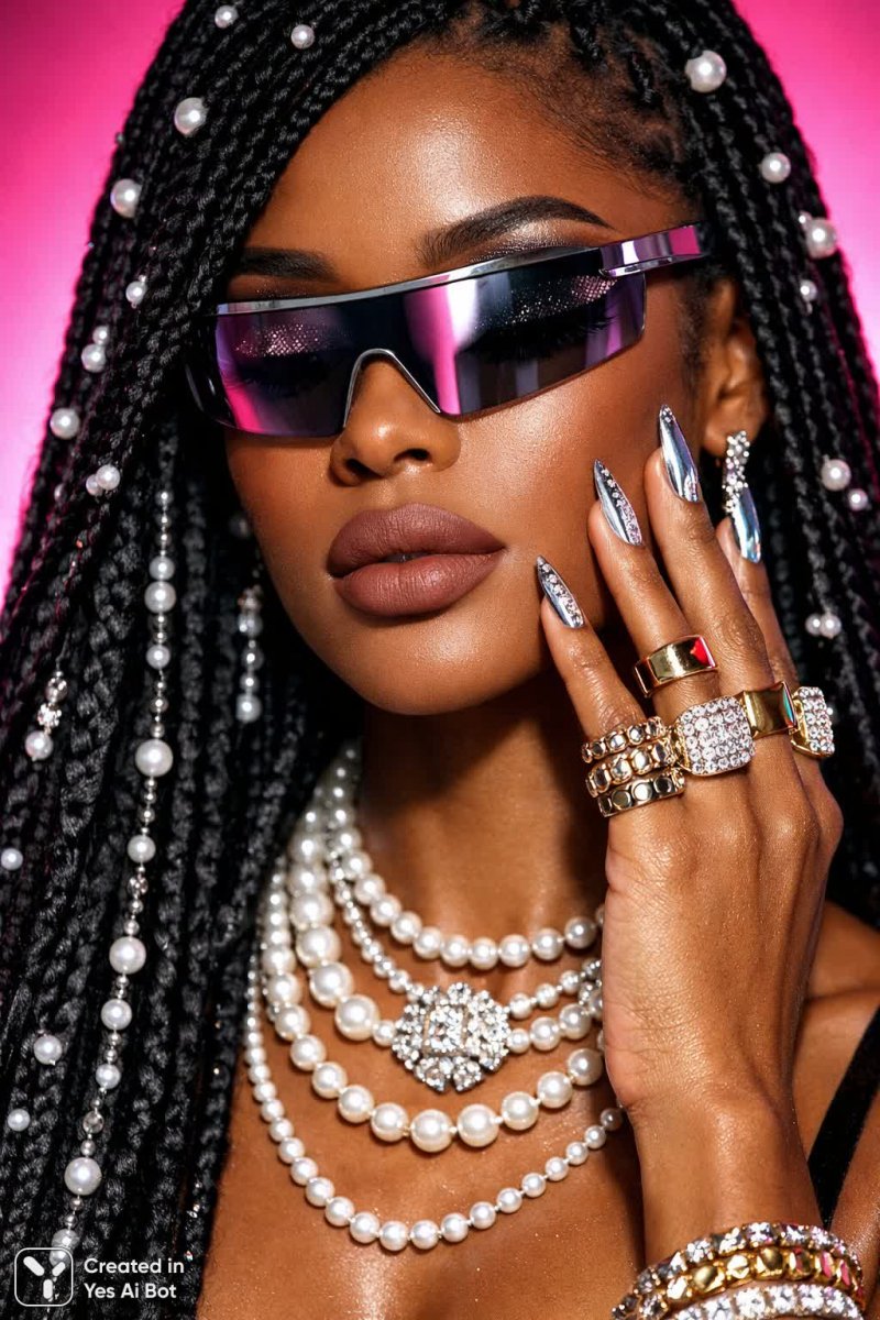 long black braided hair with pearls, dramatic glittery eyeshadow, full matte lips, chrome nails with rhinestones, chunky gold rings, layered pearl necklaces, futuristic transparent glasses, glowing neon pink BG, fashion portrait, studio lighting, close-up, high detail, glamor style.