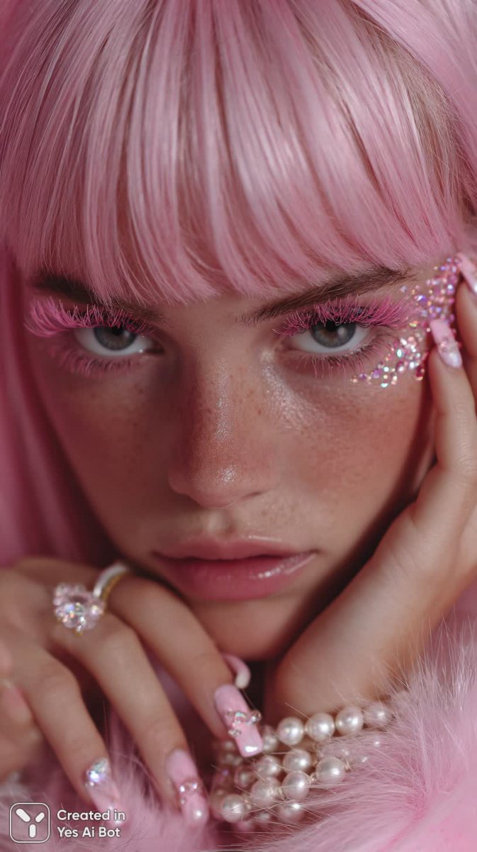 young woman with long pink hair, dramatic makeup featuring bold pink eyelashes and rhinestones, shiny lips, layered pearl necklaces, long nails with gems, soft neon pink lighting, vibrant glam style, close-up portrait, high detail, studio BG.