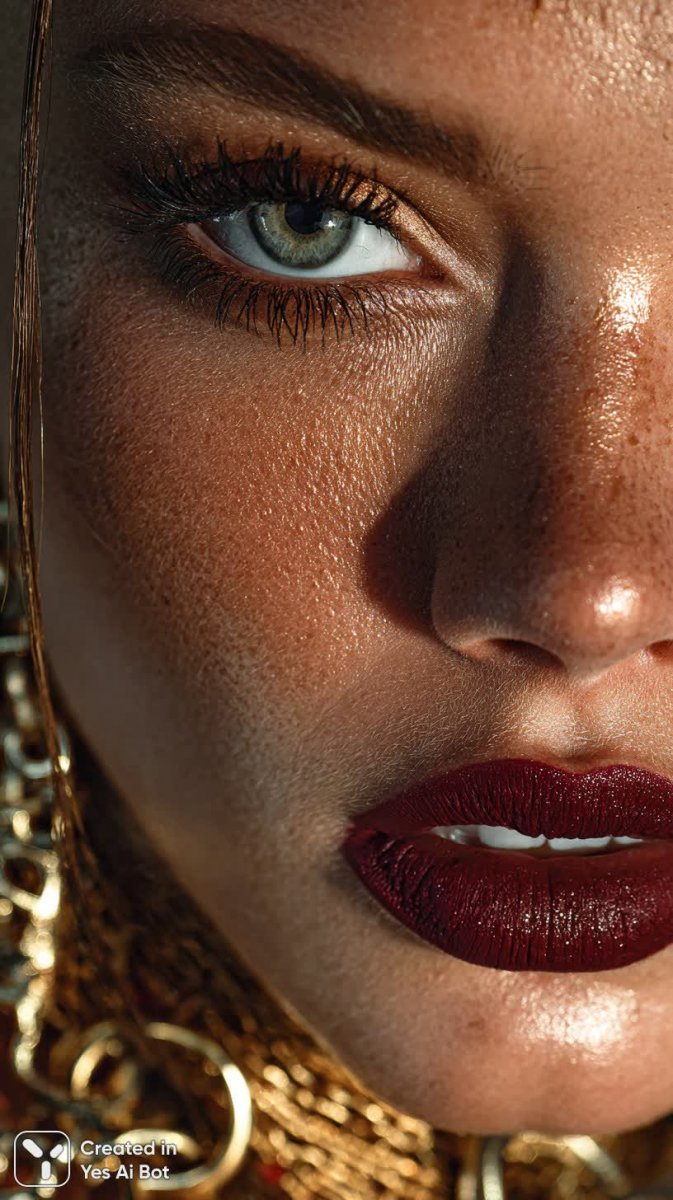 Изысканный портрет, воплощающий роскошь и гламур. В центре внимания – женское лицо крупным планом, на котором акцент сделан на выразительные глаза с драматичным макияжем и густые длинные ресницы. Насыщенный винный оттенок губ добавляет образу чувственности и глубины. Аксессуары подчеркивают статусность: массивные кольца и золотые ожерелья создают атмосферу богатства и изысканности. Мягкий размытый фон студии акцентирует внимание на модели, а высокая степень глянцевости придает фотографии ощущение роскоши и театральности. Это работа в жанре гламурной фотографии, где каждая деталь продумана до мелочей для создания эффектного и запоминающегося образа. Идеальное сочетание яркого макияжа, тщательно подобранных украшений и профессиональной световой подачи создает впечатление о женщине уверенной в себе, обладающей безупречным вкусом и стремящейся к совершенству. Портрет излучает силу, элегантность и неповторимый шарм, пленяющий взгляд своей красотой и роскошью. Это визуальное воплощение мечты о гламуре и стиле, выполненное с мастерством и вниманием к деталям. Каждая линия, каждый оттенок, каждая текстура работают на создание единого гармоничного образа, который никого не оставит равнодушным