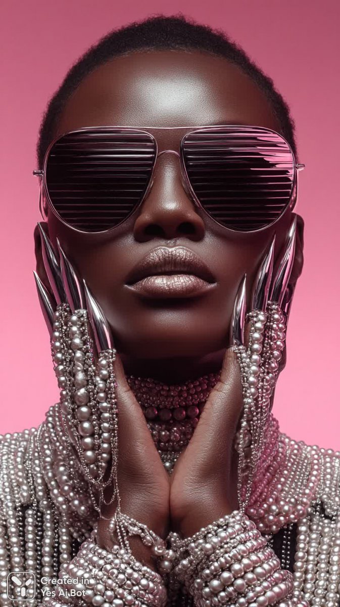 dark-skinned woman, futuristic mirrored sunglasses, long nails with chrome finish, layered pearl jewelry, glossy makeup, vibrant pink lighting, fashion portrait with high detail, abstract soft BG, glam style.