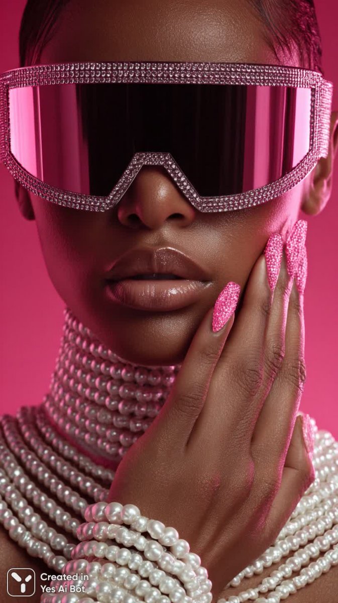 dark-skinned woman with futuristic mirrored visor sunglasses, long pink nails decorated with rhinestones, glossy lips, layered pearl necklaces, vibrant pink neon lighting, glamor style, portrait close-up, studio photography, rich detail, dark BG.