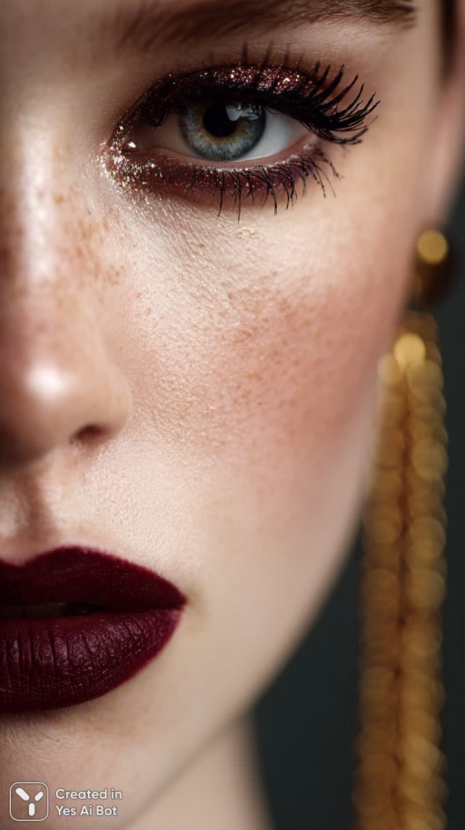 female face close-up, ornate makeup with deep burgundy lips and shimmering eyeshadow, sculpted cheekbones, long false eyelashes, gold accents, matte skin, blurred background, high detail, fashion photography.