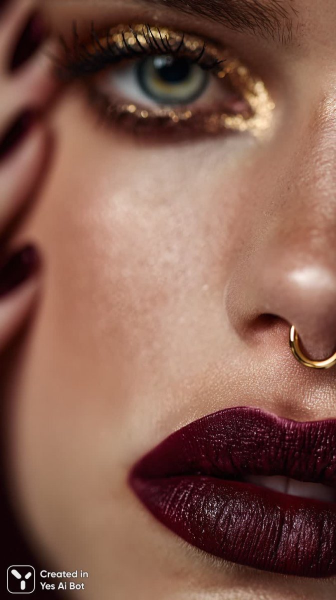 female face close-up with dramatic makeup, deep burgundy lips, gold accents on eyelids, sculpted nose with piercing, bold false eyelashes, long nails with gems, matte skin, glamor style, studio lighting, blurred background.