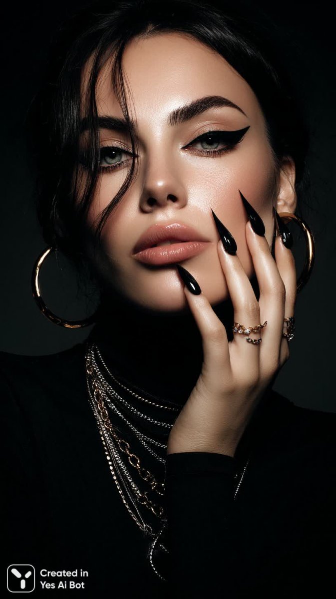 Изысканная женственность в каждом элементе: завораживающий портрет, где роскошь и драматизм сливаются воедино. Акцент на безупречном макияже с выразительной стрелкой подчеркивает глубину взгляда, а длинные черные ногти, украшенные сверкающими драгоценными камнями, добавляют нотку дерзости и гламура. Многослойное серебряное ожерелье деликатно обрамляет шею, создавая ощущение утонченности, а крупные золотые кольца для волос придают образу завершенность и сияние. Идеальное освещение студии мягко подчеркивает детали, передавая атмосферу глянцевого журнала. Мягкий размытый фон позволяет сосредоточиться на красоте модели и ее безупречном стиле. Каждая деталь продумана до мелочей, создавая впечатление высочайшего качества и мастерства исполнения. Это не просто портрет – это воплощение роскоши, уверенности в себе и неповторимого женского шарма. Безупречная техника съемки позволяет передать мельчайшие нюансы текстуры кожи и блеск украшений, делая изображение невероятно реалистичным и привлекательным. Вся композиция дышит элегантностью и изысканностью, являясь настоящим произведением искусства. Такой образ идеально подойдет для рекламной кампании ювелирных изделий или косметики премиум-класса, подчеркивая их эксклюзивность и роскошь. Это визуальная ода женской красоте и силе, запечатленная в моменте вечной элегантности