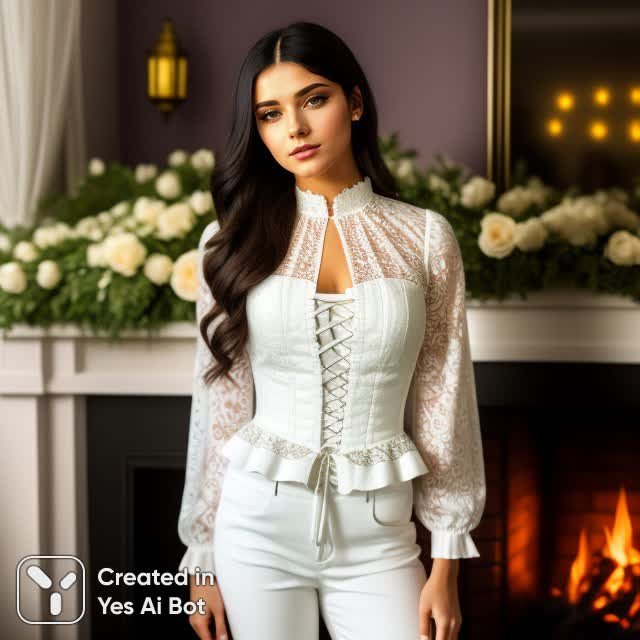 Изящный портрет молодой женщины, облаченной в белоснежный корсет с деликатной рюшевой отделкой и стильные брюки с высокой талией, пленяет своей контрастной красотой. Она нежно держит в руках роскошный букет из огромных белых роз, символизирующих чистоту и вечную любовь. Ее фигура слегка развернута к зрителю, а голова грациозно наклонена вбок, придавая снимку легкости и элегантности. Волосы, словно волны морского прибоя, мягко обрамляют лицо, подчеркивая безупречный макияж: тонкие черные стрелки, выразительные ресницы и нежно-коричневые матовые губы создают образ загадочности и чувственности. Теплое освещение, исходящее из ламп позади нее, окутывает ее мягким сиянием, а хайлайтер деликатно подчеркивает контуры тела, придавая снимку объемность и живость. Фоном для этого воссоединения красоты и нежности служит светлый зал с уютным камином, создающий атмосферу тепла и уюта. Детализированное изображение в разрешении 8K позволяет рассмотреть каждую прожилку на лепестках роз, каждый стежок на изысканном корсете и каждое мельчайшее нюанс окружающего пространства. Это портрет, запечатлевший момент гармонии, красоты и вечной женственности