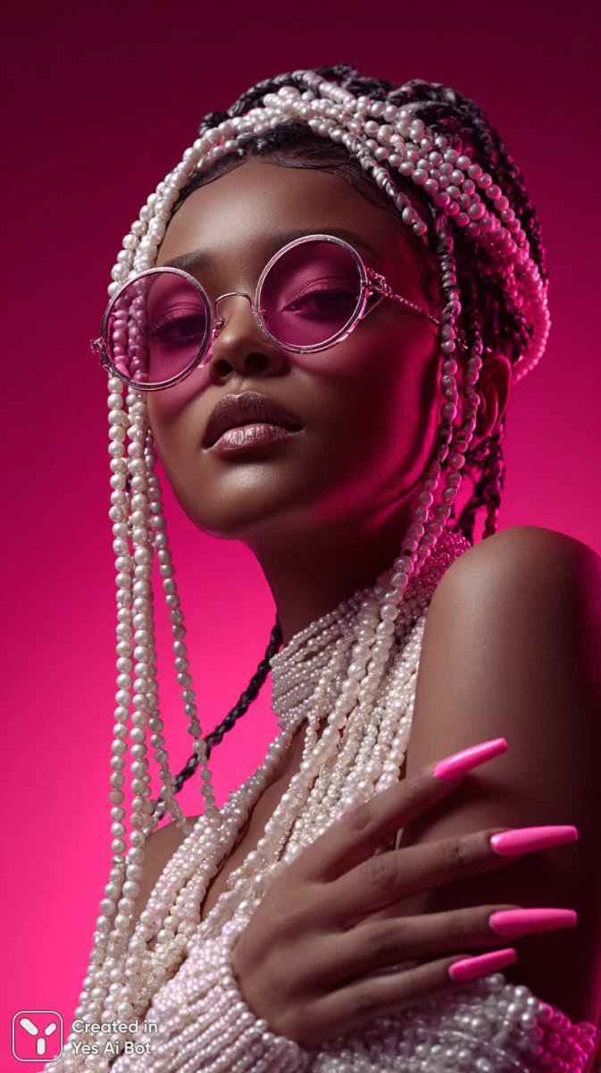 woman with long braids adorned with pearls, striking pink nails, sparkling makeup, oversized sunglasses, layered necklaces, vibrant fantasy style, studio lighting, close-up, BG neon with abstract shapes.