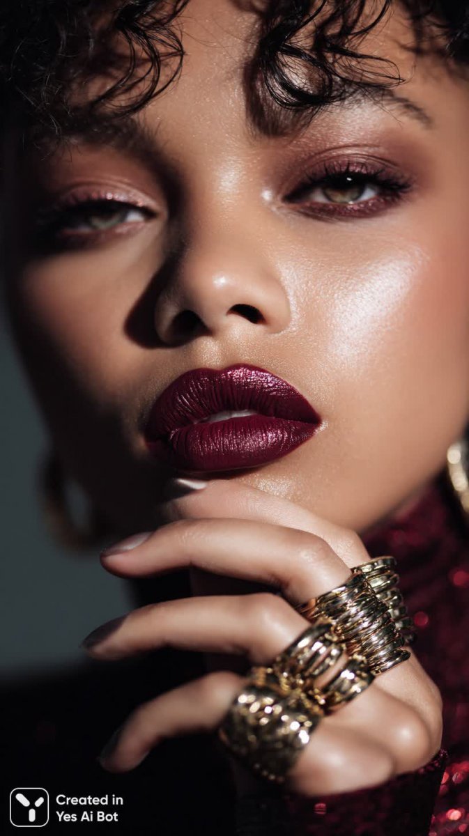 woman with dramatic makeup featuring deep wine lipstick, large decorative earrings, multiple chunky rings, glamorous outfit, close-up focus on face and hands, high gloss, studio lighting, soft blurred background.