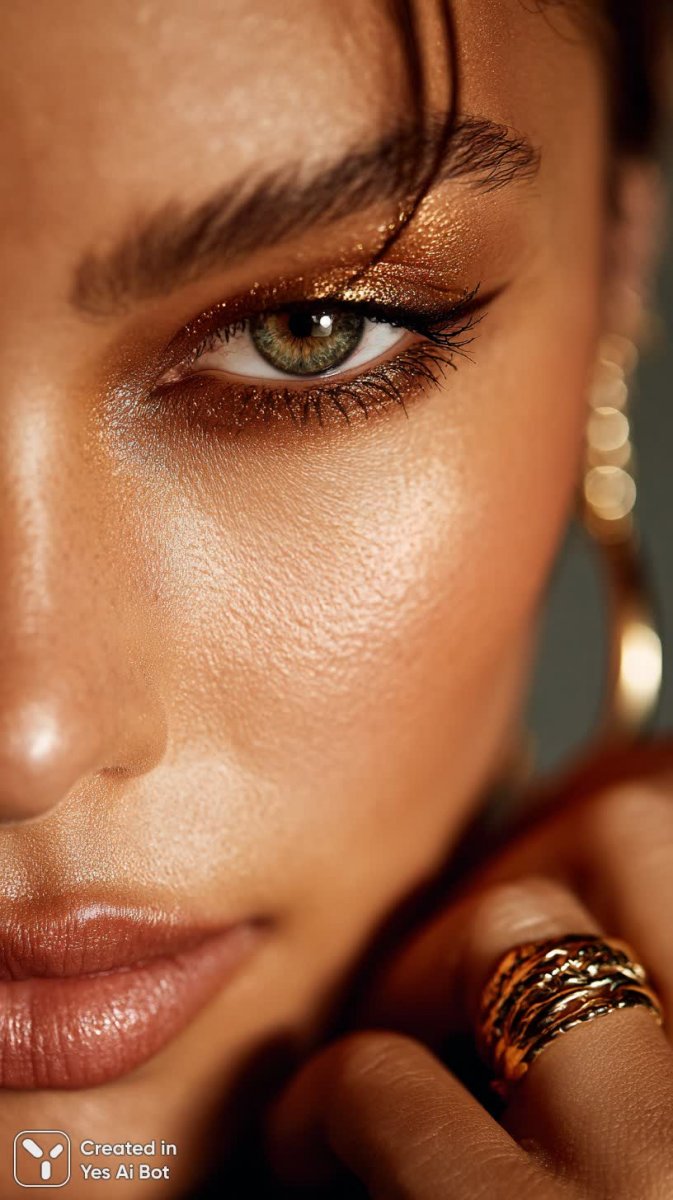 Изысканный портрет демонстрирует пленительную красоту женщины крупным планом. В центре внимания – лицо с безупречным макияжем, где мерцающие золотые тени создают эффект роскоши и сияния. Тщательно вылепленные черты лица подчеркивают скульптурность и выразительность, а длинные ресницы добавляют взгляду магнетизма и глубины. Элегантные декоративные серьги и кольца завершают образ, привнося нотку изысканности и утонченности. Теплый оттенок кожи, напоминающий о загаре, создает ощущение здоровья и жизненной силы. Мягкое студийное освещение подчеркивает текстуру кожи и акцентирует внимание на деталях макияжа. Размытый фон позволяет сосредоточиться исключительно на лице, создавая эффект глубины и объема. Вся композиция пронизана атмосферой роскоши и гламура, воплощая в себе идеал женственности и красоты. Изображение излучает уверенность и привлекательность, передавая ощущение внутреннего благополучия и неповторимого стиля. Это портрет женщины, которая знает свою ценность и умеет подчеркнуть свою индивидуальность с помощью безупречного вкуса и элегантности. Каждое движение лица, каждый оттенок макияжа тщательно продуман и создает гармоничный образ, который завораживает своей красотой и изысканностью. Портрет – это ода женской силе и грации, воплощенная в визуальной форме