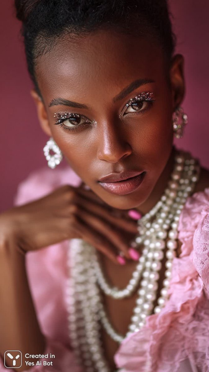 Изысканный портрет демонстрирует уверенную в себе женщину с глубоким цветом кожи, чья красота подчеркнута яркими деталями и профессиональным освещением студии. Длинные розовые ногти, украшенные мерцающими стразами, привлекают внимание к безупречно ухоженным рукам, а драматичный макияж глаз с добавлением блесток придает образу особую выразительность и гламур. Многослойные жемчужные ожерелья элегантно обрамляют шею, создавая ощущение роскоши и изысканности. Большие кольца в ушах служат завершающим штрихом, подчеркивающим стиль и индивидуальность модели. Мягкий размытый фон позволяет сосредоточиться на деталях лица и аксессуаров, обеспечивая эффектную композицию и создавая атмосферу роскоши и гламура. Портрет излучает уверенность, силу и неповторимый шарм, представляя собой настоящее произведение искусства в жанре глянцевой фотографии. Использование студийного освещения позволяет максимально раскрыть красоту кожи и подчеркнуть глубину взгляда модели. Этот портрет – воплощение современной женской красоты и элегантности, сочетающее в себе смелость и изысканность. Каждая деталь продумана до мелочей, создавая неповторимый образ, который завораживает и вдохновляет