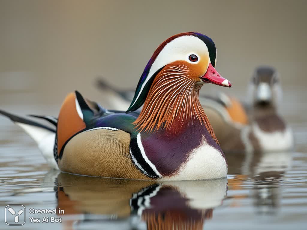 На этой завораживающей фотографии запечатлены два мандариновых утя – редкие и необычайно красивые птицы, плавающие в спокойной воде. В центре внимания находится сам самец, демонстрирующий всю палитру своих ярких перьев. Его голова кремового цвета гармонично сочетается с клювом насыщенного бордового оттенка. Грудь украшена пестриной из ржаво-коричневых перьев и замысловатых узоров, а крылья поражают своей яркостью оранжевого цвета. Внимание к деталям невероятно: на спине, крыльях и боках можно разглядеть вкрапления фиолетового, синего и черного цветов, создающие неповторимый рисунок. За самцом, чуть позади, расположилась самка, чье оперение отличается более приглушенной цветовой гаммой: серые, коричневые и белые тона контрастируют с яркостью самца, подчеркивая его особенность. Оба утка выглядят абсолютно расслабленными, их отражения едва заметны на гладкой водной поверхности, что создает ощущение покоя и гармонии. Мягкое, рассеянное освещение нежно озаряет сцену, а размытый фон нейтральных тонов символизирует естественную среду обитания птиц. Композиция фокусируется исключительно на утях и воде, создавая интимную атмосферу. Использование телеобъектива позволило максимально передать мельчайшие детали оперения этих удивительных созданий. В целом, фотография излучает спокойствие и натурализм, являясь прекрасным примером мастерства фотографа в запечатлении красоты дикой природы. Картина дарит зрителю ощущение умиротворения и восхищения перед великолепием животного мира