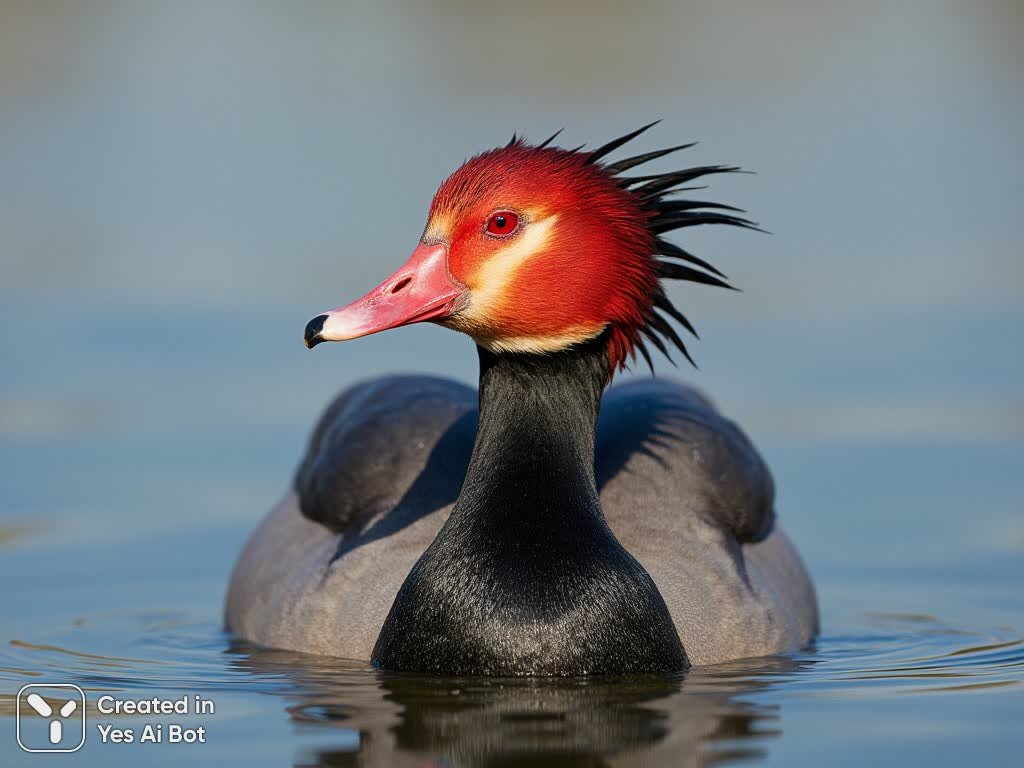 Крупный план селезня с яркой рыжей головой и хохолком. Контрастное черно-серое оперение тела, ярко-красные глаза и клюв. Утка неподвижно плывет по спокойной воде, слегка изогнув шею. Фокус на глазах птицы