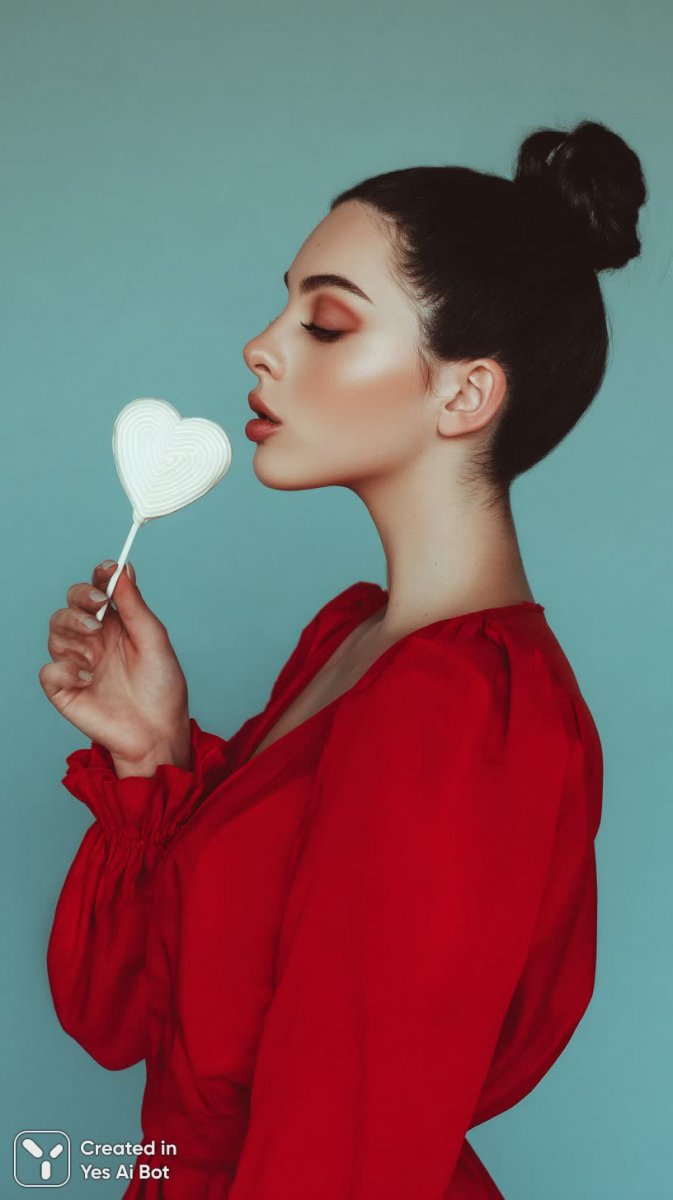 Изысканная красота и дерзкий шик воплотились в этом завораживающем образе молодой женщины. Ее темные волосы, собранные в элегантный пучок, подчеркивают безупречность линий лица и придают образу утонченность. Выразительный макияж глаз, выполненный с драматическим акцентом, притягивает взгляд и раскрывает внутреннюю страсть. Роскошное алое платье без бретелек идеально облегает фигуру, демонстрируя ее грацию и уверенность в себе. В руках она держит сердечную леденцу – игривый аксессуар, добавляющий нотку кокетства и беззаботности в этот гламурный ансамбль. Чистый белый фон создает эффект минимализма, позволяя полностью сосредоточиться на красоте модели и ее чувственном образе. Фотосессия выполнена в стиле глянцевой моды, с акцентом на детали и безупречное освещение, что придает снимку атмосферу роскоши и изысканности. Это изображение – квинтэссенция современной женственности, сочетающая в себе силу, нежность и неповторимый шарм. Каждая деталь продумана до мелочей, создавая впечатление произведения искусства, которое завораживает своей красотой и вдохновляет на новые свершения. Образ излучает уверенность и привлекательность, оставляя неизгладимое впечатление у зрителя. Это воплощение гламура в его лучшем виде – дерзкого, элегантного и незабываемого