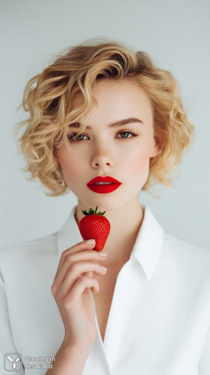 woman with fair skin and wavy blonde hair, bold makeup with red lipstick, holding ripe strawberry, neutral light BG, beauty photography style, sharp focus on face, professional retouching.