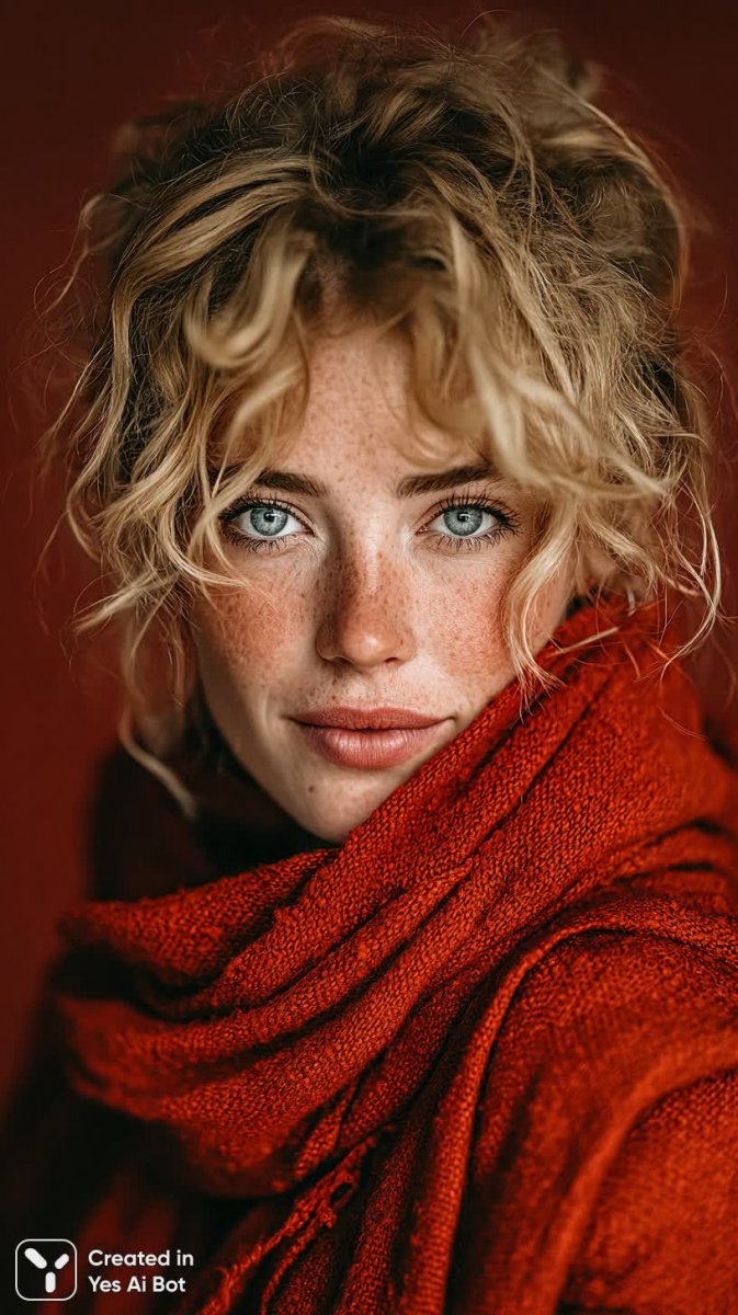 midjourney Девушка с волнистыми волосами и красным шарфом: мягкий свет и романтика в деталях. Картинка из нейросети Midjourney