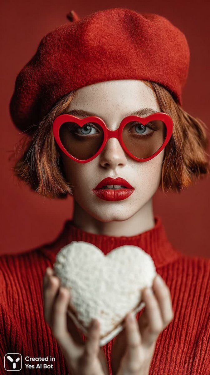 young woman with fair skin, red beret, and red heart-shaped sunglasses, posing with a heart-shaped cake, romantic style, studio lighting, solid red BG, 8k quality, portrait shot, canon eos r5 camera, 50mm lens --s 750